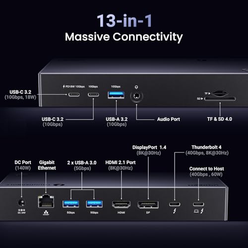 13-in-1 Connectivity: The Revodok Max 313 Thunderbolt 4 Dock includes all the ports you need for fast and seamless connections, two 40Gbps Thunderbolt 4 ports, a HDMI 2.1 port, a DisplayPort 1.4, a USB-C ports(10Gbps,18W), a 10Gbps USB-C data port, a 10Gbps USB-A data ports, two 5Gbps USB-A data ports, a 1Gbps ethernet, SD/TF 4.0 card reader, a 3.5mm audio and a 140W DC-IN.