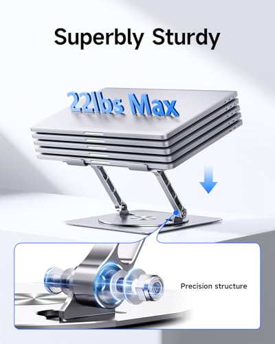 【Incredibly Robust & Ultra Compact】: Made of premium aluminum alloy, the laptop riser can support up to 22lbs (10 kg) with larger turntable base, which ensures remarkable durability. Reinforced hinge joints prevent wobbling, maintaining stability even during typing. In addition, the computer stand can be folded into a compact size and slips effortlessly into backpacks or laptop sleeves. Ideal for home, office and business travel