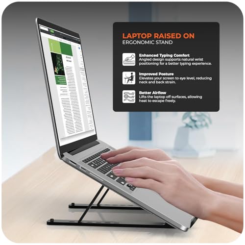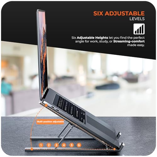 [ERGONOMIC AND ADJUSTABLE] – Experience unique comfort with this 6-level adjustable laptop riser stand, allowing you to raise your device between 2.78” to 6.5” in height. Achieve the perfect eye level to maintain proper posture, reducing neck strain, back pain, and eye fatigue.
