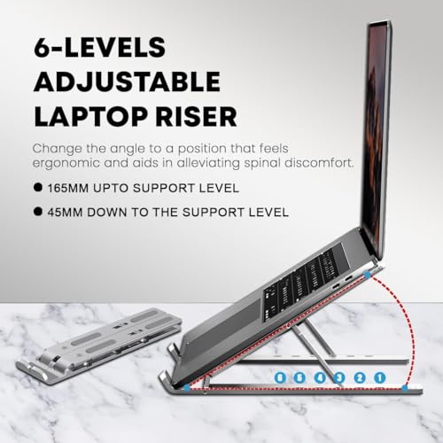 【6-Levels Foldable Laptop Riser】: Our laptop stand for desk is easily adjust height with 6 levels for improved posture, reducing wrist aches, neck stiffness, back pain, and eye strain.