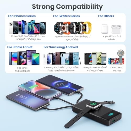 【Wide Compatibility】 This external battery pack is widely compatible with iPhone 16/15/14/13/12 series, Sumsung Galaxy, Google Pixel, as well as Apple Watch 10/9/8/7/6/5/4/3/2/1/SE/Ultra, and other Type C/Micro usb devices or tablets