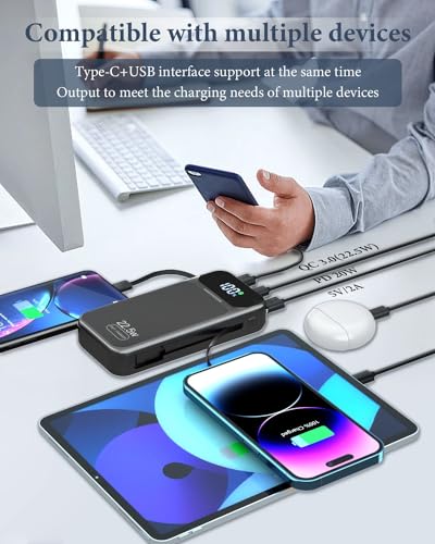 【Power Up 4 Devices with Ease】With built-in cables and two USB outputs, this portable power bank enables hassle-free charging for up to four devices simultaneously. No more tangled cords and multiple chargers, enjoy convenient charging for you and your companions.
