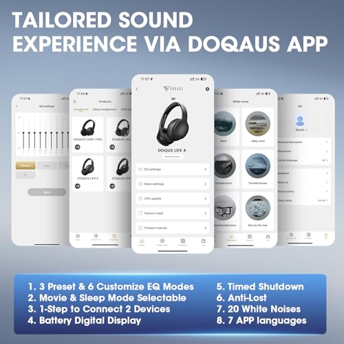 【Incredible Sound Quality with 9 EQ Modes】Powered by dual 40mm dynamic driver, the rich details of high-resolution make the sound vivid and immersive. And this bluetooth headphones have 9 EQ modes, which you can freely switch between well-balanced, bass boosted and high definition sounds, White noises w/App control. DOQAUS upgraded over ear headphones provide you with a listening feast and enjoy immersive music. A perfect choice for music lovers