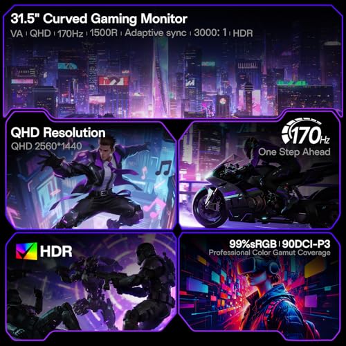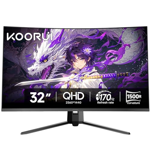 KOORUI 32 inch Curved Gaming Monitor,1440p(2560×1440),170Hz.1ms, 2K, QHD,VA 1500R, HDR10,Adaptive Sync, VESA & Eye Care Ultra-Thin Support DP/HDMI
