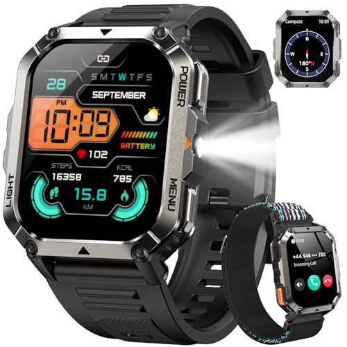 Military Smart Watch for Men(Answer/Make Calls),2.01″Fitness Watch with Compass/Flashlight/100 Days Battery/Heart Rate/SpO2/Sleep Monitor/100+ Sports/IP68 Waterproof,Outdoor Smartwatch for Android iOS