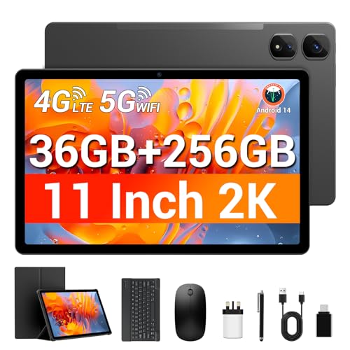 WITECOR 2025 Newest 11 inch Tablet, 2K FHD Display, 4G LTE Dual SIM 36GB RAM 256GB ROM/1TB Expand, Android 14, 9580mAh, Octa Core, 5G WiFi/13MP/GPS/GSM/OTG, 2 in 1 Tablets with Keyboard/Mouse/Case