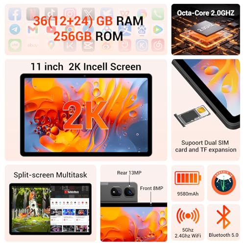 🌟【Massive 36GB RAM + 256GB ROM (Expandable to 1TB)】Never run out of space with 36GB (12+24 virtual) RAM and 256GB internal storage—expandable via microSD up to 1TB. Store endless apps, photos, videos, and files without slowing down your tablet.